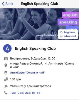 Friends! Information about our weekly Speaking Club is posted on the new GoEng! This is an application in which you will find all the details about English speaking clubs - when, where, how much it costs, for whom and about what.